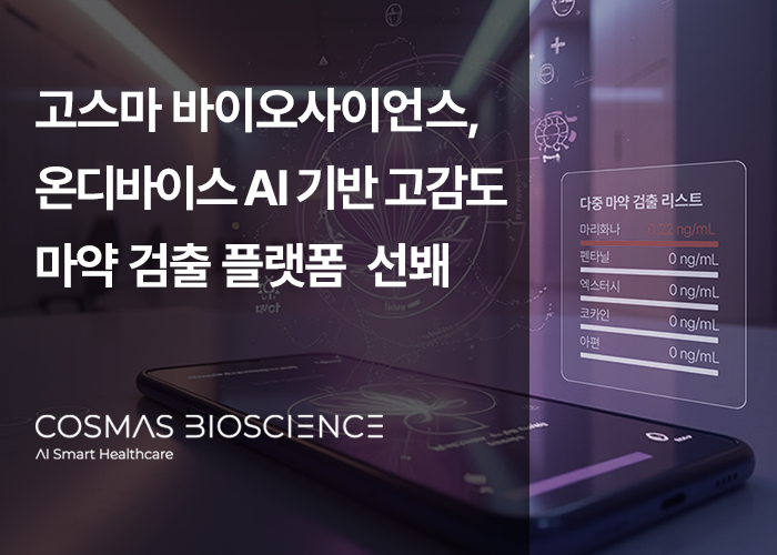 AI 디지털 헬스케어 기업 고스마 바이오사이언스(COSMAS Bioscience)가 '온디바이스 AI 기반 고감도 다중 마약 검출 플랫폼'을 선보이며 시장의 주목을 받고 있다고 밝혔다.